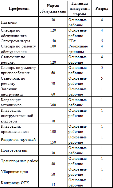 Таблица 4.2 - Нормы обслуживания и разряд вспомогательных рабочих