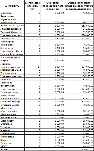 После заполнения таблиц определяем суммарную годовую заработную плату основных, вспомогательных рабочих, управленческих работников, специалистов, служащих и МОП.