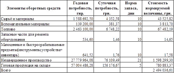 Сумма стоимости нормируемых величин элементов оборотных средств составляет нормируемую величину оборотных средств. Годовая потребность по элементам находится следующим образом.