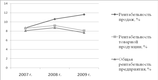 рентабельность продаж в 2009 году по отношению к 2007 году возросла на 2,89 % и составила 11,61%, но при этом она осталась на не высоком уровне;