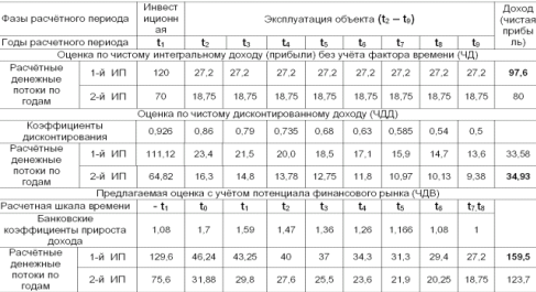 В экспертной оценке преимущества 1-го инвестиционного проекта тоже велики и выражаются в его инновационности, большей годовой прибыли и возможности её приумножить на финансовом рынке, большей рентабельности выручки в фазе эксплуатации объекта. Реализация его гарантирует повышение конкурентоспособности производства и продукции предприятия. Но все эти преимущества обесцениваются показателями эффективности действующей системы, в отношении которых большие сомнения вызывают результаты учёта фактора времени посредством дисконтирования. Расчёты с учётом фактора времени по предлагаемой методике эти сомнения устраняют: доход 1-го инвестиционного проекта гораздо больше.