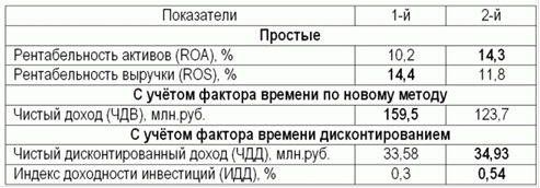Если принимать во внимание итоги сравнения по ЧДВ, то 1-й инвестиционный проект является безусловно лучшим. Однако ЧДВ, как и его аналог ЧДД, не является показателем эффективности, поскольку не показывает отдачу на 1 руб. затрат. Индекс дисконтированного дохода инвестиций выше во 2-м проекте. Оценки же по простым показателям рентабельности противоположны: по рентабельности активов лучшим является 2-й, по рентабельности выручки - 1-й инвестиционный проект. В теории эффективности капиталовложений примат показателей ИДД и рентабельности активов незыблем. Поэтому лучшим является 2-й инвестиционный проект. Однако ряд соображений вызывает сомнения.