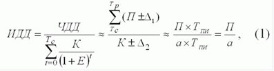 Очевидно, удаление от ИДД фактора времени показывает незначительное отношение прибыли к амортизации. Если же учесть, что доля амортизации в структуре затрат на производство продукции в экономике ~ 5,5% (а = 0,055С), то «очищенное» значение ИДД приобретает количественную определённость: ИДД = П / 0,055С.