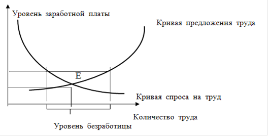 Кривая спроса на труд отражает спрос на труд со стороны предпринимателей. Кривая предложения труда отражает его величину в связи с изменением уровня заработной платы. Если уровень оплаты труда будет повышен с точки D до точки С, это, с одной стороны, приведет к сокращению спроса на труд до величины СА, то есть к увольнению части наемных работников, с другой стороны, это приведет к увеличению предложения на труд на величину АВ. Возвращение в точку равновесия Е приведет к исчезновению безработицы: весь спрос на труд будет удовлетворен его предложением при данной цене труда на уровне точки D.
