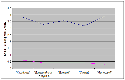Анализируя полученные расчеты можно сделать следующий вывод, наиболее сильным конкурентом для магазина «Домашний очаг на Мухина» (0,4) является «Строймода» (0,6). Торговые предприятия «Домовой» (0,4) и «Умелец» (0,4) имеют аналогичное значение, т.е. занимают слабый уровень конкурентоспособности. Низкий уровень занимает предприятие «Мастеровой» (0,3).