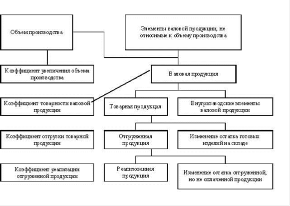 Приведенный рисунок иллюстрирует взаимосвязь показателей продукции. Для перехода от объема производства к валовой продукции следует присоединить те элементы валовой продукции, которые не относятся к объему производства. В зависимости от избранного показателя объема производства эти элементы могут быть различными.