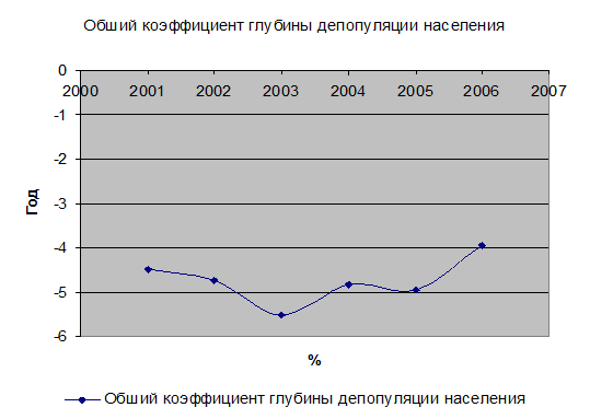 Из рисунка 5 видно, что на величину общего коэффициента глубины депопуляции больше всего повлияло сокращение численности населения в 2003 году. В целом, коэффициент глубины депопуляции не имел положительного значения ни в одном исследуемом году, подтверждая наличие постоянной депопуляции населения. Но в 2006 г. он снизился по сравнению с 2005 на 1,01‰ и достиг -3,94‰, что является самым наименьшим значением общего коэффициента глубины депопуляции за исследуемый период.