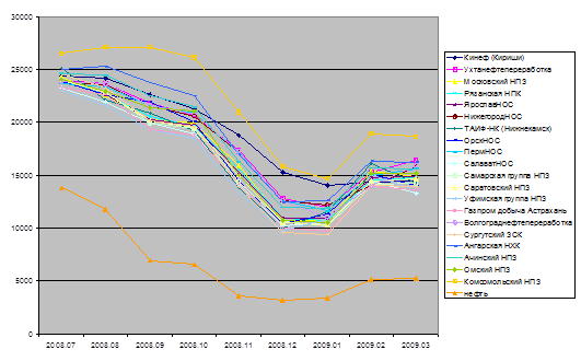 ) резкое повышение отпускных цен на всех основных нефтеперерабатывающих заводах, не соответствующее динамике цен на нефть(отображено на рисунке 4):