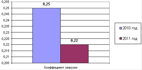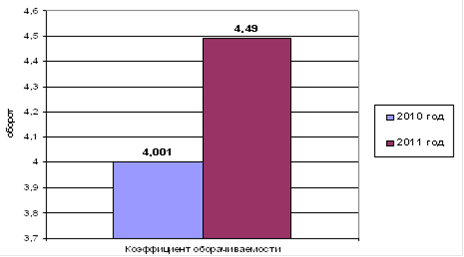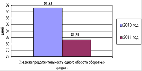 По данной таблице можно сделать вывод, что коэффициент оборачиваемости за 2011 год в сравнении с 2010 годом увеличился на 0,49 оборота. Коэффициент загрузки за 2011 год по сравнению с 2010 годом уменьшился на 0,03, а средняя продолжительность одного оборота оборотных средств за 2011 год по сравнению с 2010 годом уменьшилась на 9,94 дня.