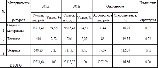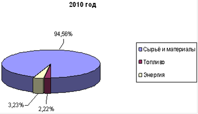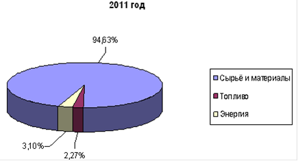 Рассмотрим изменение структуры: за 2011 год по сравнению с 2010 годом удельный вес сырья и материалов увеличился на 0,07%, удельный вес топлива за 2011 по сравнению с 2010 годом увеличился на 0,05%, а удельный вес энергии за 2011 год по сравнению с 2010 годом уменьшился на 0,13%.