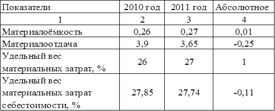 По данной таблице видно, что материалоёмкость за 2011 год по сравнению с 2010 годом увеличилась на 0,01 руб./руб., а материалоотдача за 2011 по сравнению с 2010 годом уменьшилась на 0,25 руб./руб.